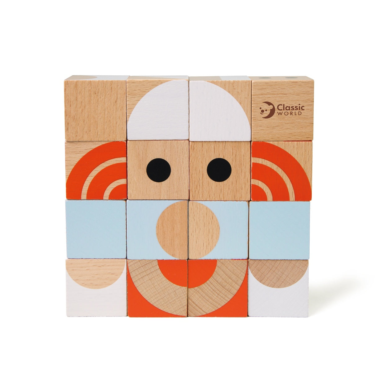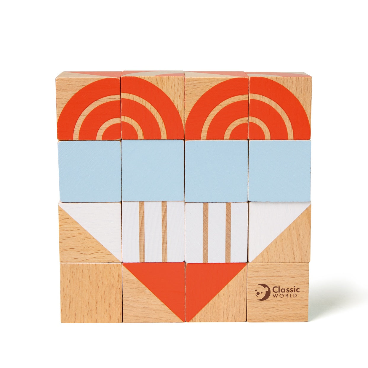 Es un conjunto único de bloques de madera decorados con varios patrones geométricos en cada lado. Los niños pueden construir hermosos patrones geométricos con instrucciones y también crear sus propios gráficos ideales mediante la imaginación. Excelente para el primer intento del pequeño de aprender, construir, apilar y crear formas.