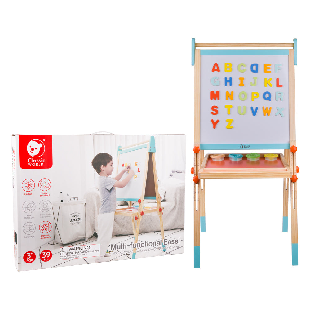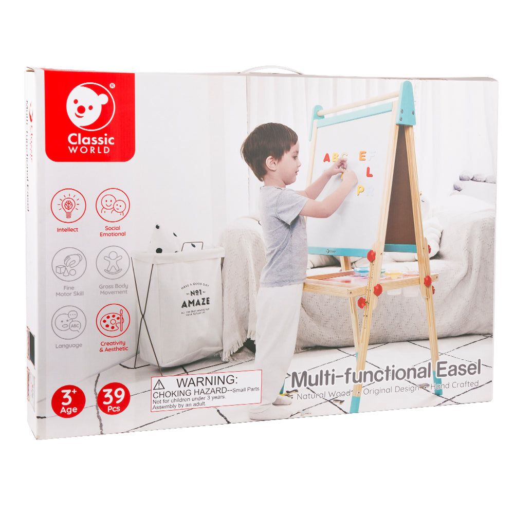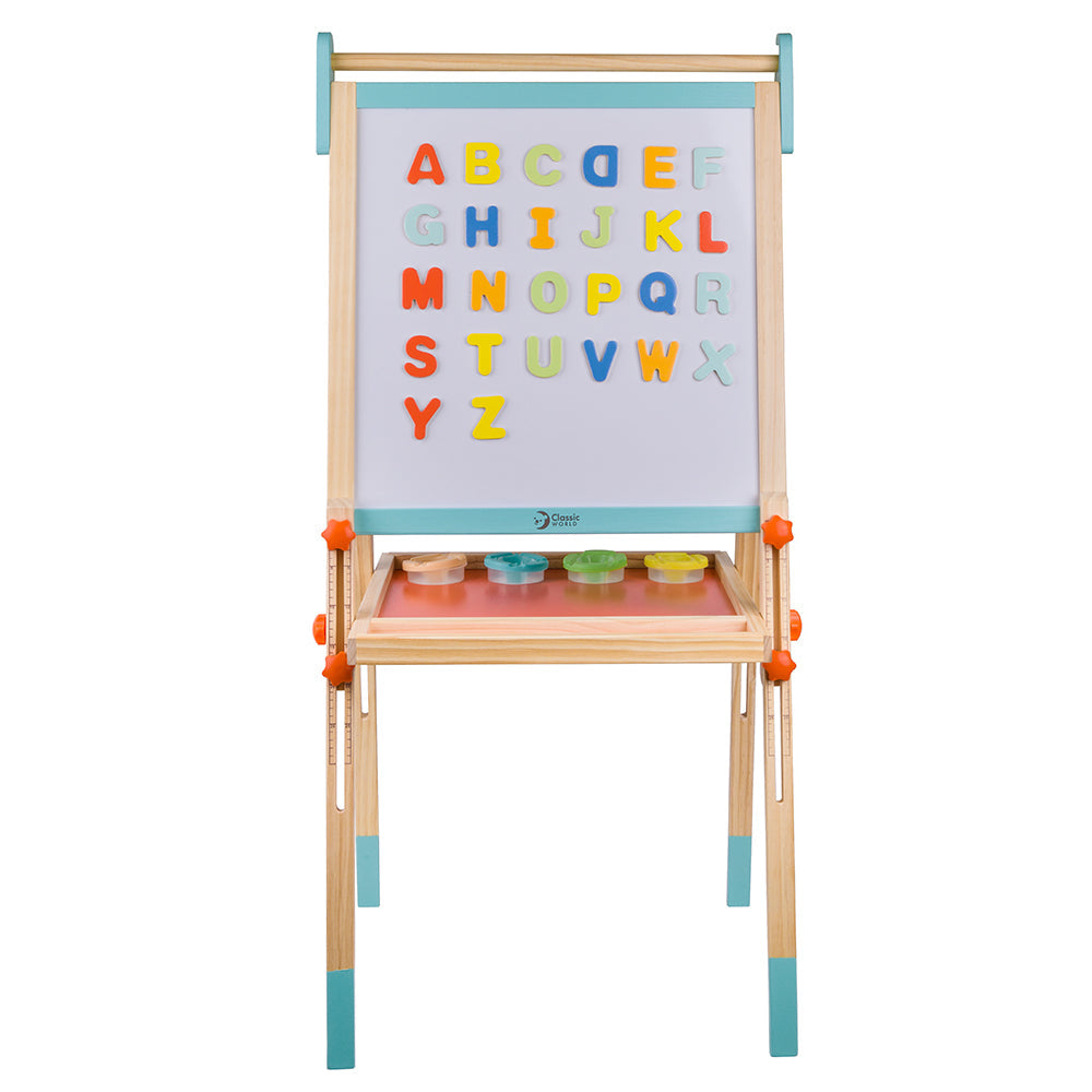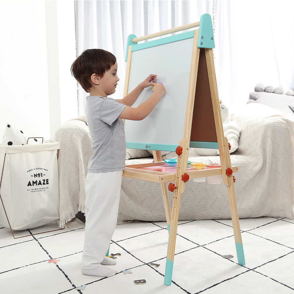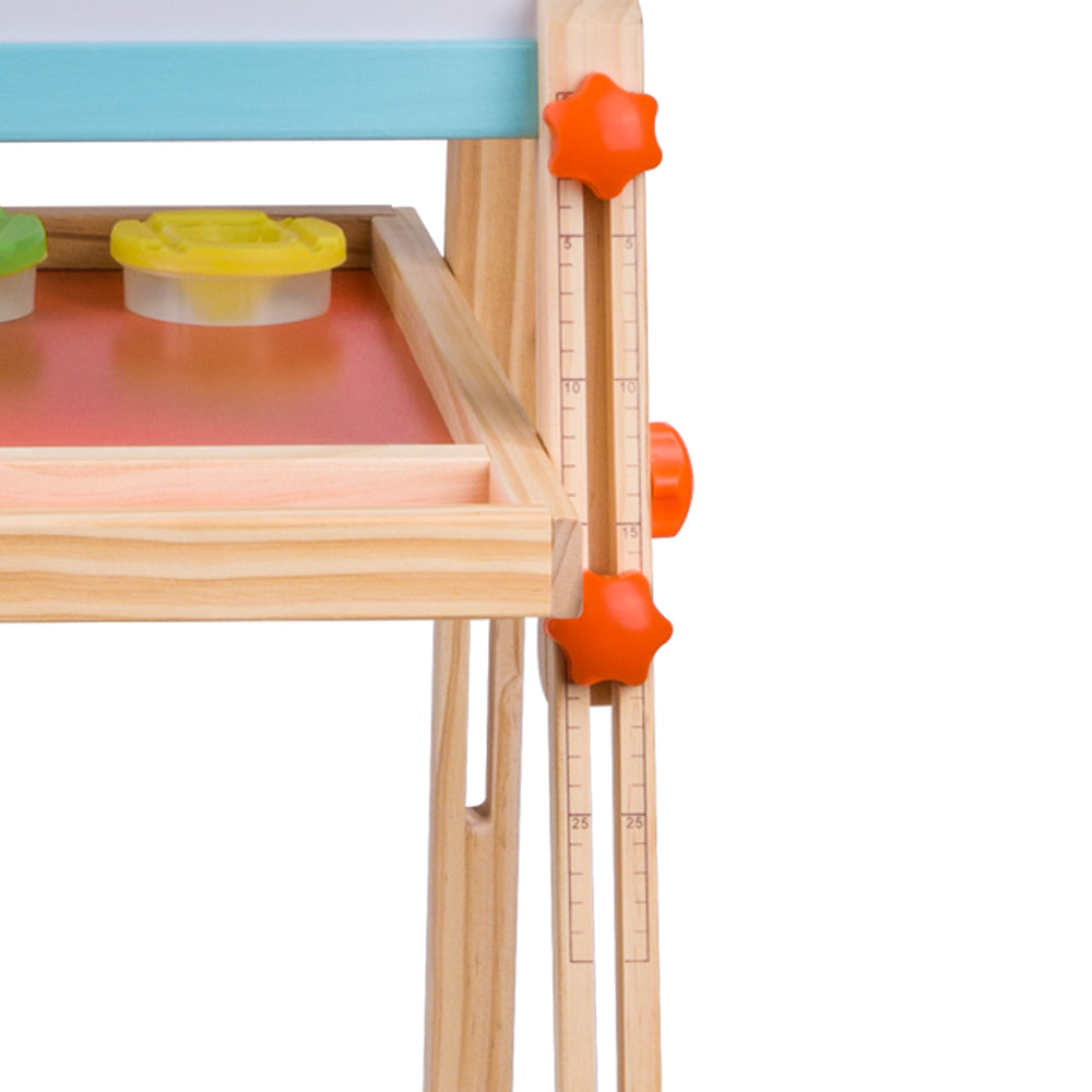Este caballete plegable tiene una pizarra de gis y una pizarra magnética para que los niños creen bonitos dibujos. La escala en los marcos laterales es fácil de ajustar en altura. Incluye contenedores de pintura de plástico y letras magnéticas. Les ayuda a aprender idiomas y desarrollar su creatividad.