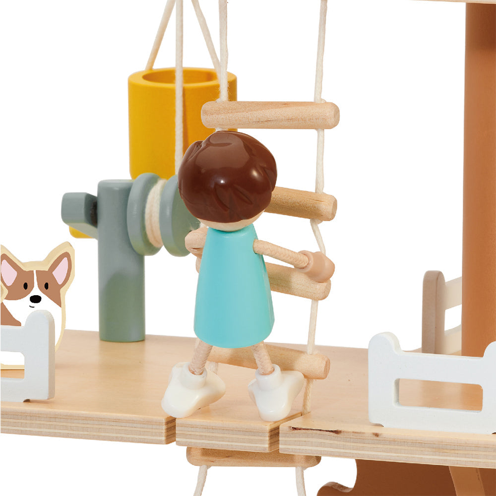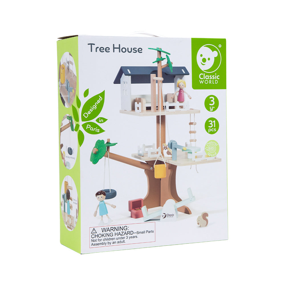 ¡Qué bonita casa en el árbol! Con 2 figuras humanas, 2 animales y fantásticos accesorios que incluyen columpio, balancín, polea, cubo, cofre del tesoro, cama, mesa y sillas.