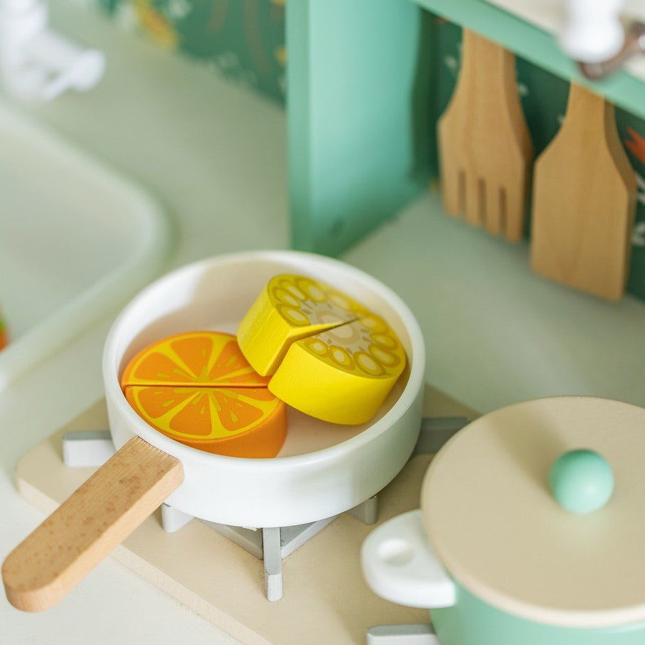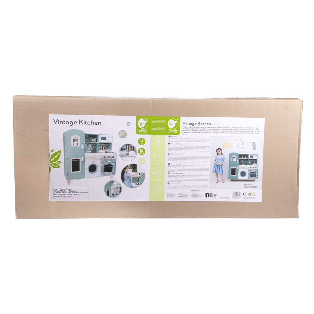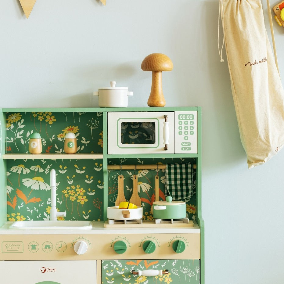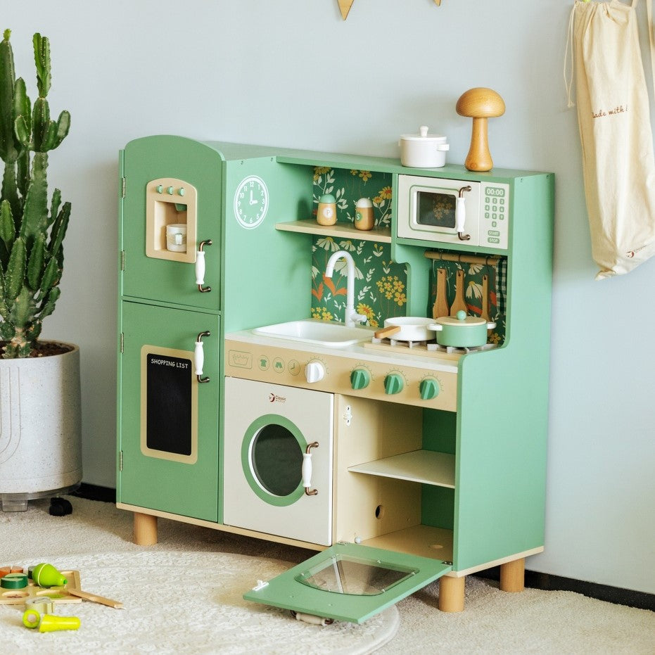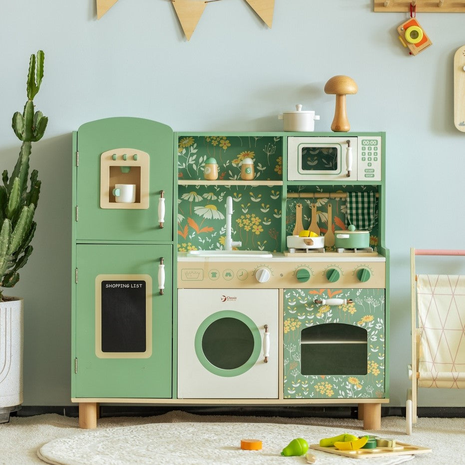 Esta cocina de juguete de madera es predominantemente verde con hermosos diseños florales, lo que da como resultado un estilo retro clásico para que disfruten los niños. El conjunto incluye muchas áreas funcionales como fregadero, cocina, armarios, lavavajillas y más. Los niños pueden escribir los ingredientes que necesitan para prepararse o simular la acción de cocinar en la estufa, obteniendo una experiencia culinaria increíble.