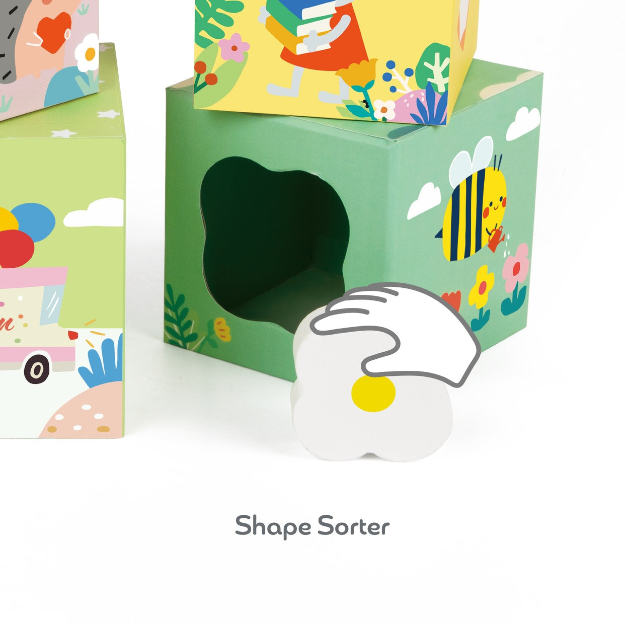 Se trata de un cubo apilable con temática forestal, con una variedad de elementos forestales como plantas, animales e insectos en diferentes lados. Los niños pueden apilar las cajas para hacer una alta torre y también pueden jugar juegos de clasificación de formas con bloques de diferentes formas.