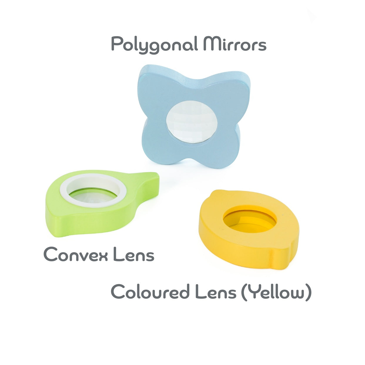 Experimentos ópticos, que incluyen un caleidoscopio, una caja de rejilla, un disco giratorio y un triple prisma, ofrecen una experiencia agradable e iluminadora.