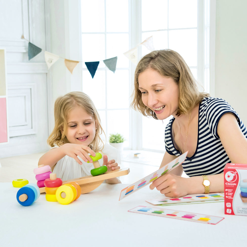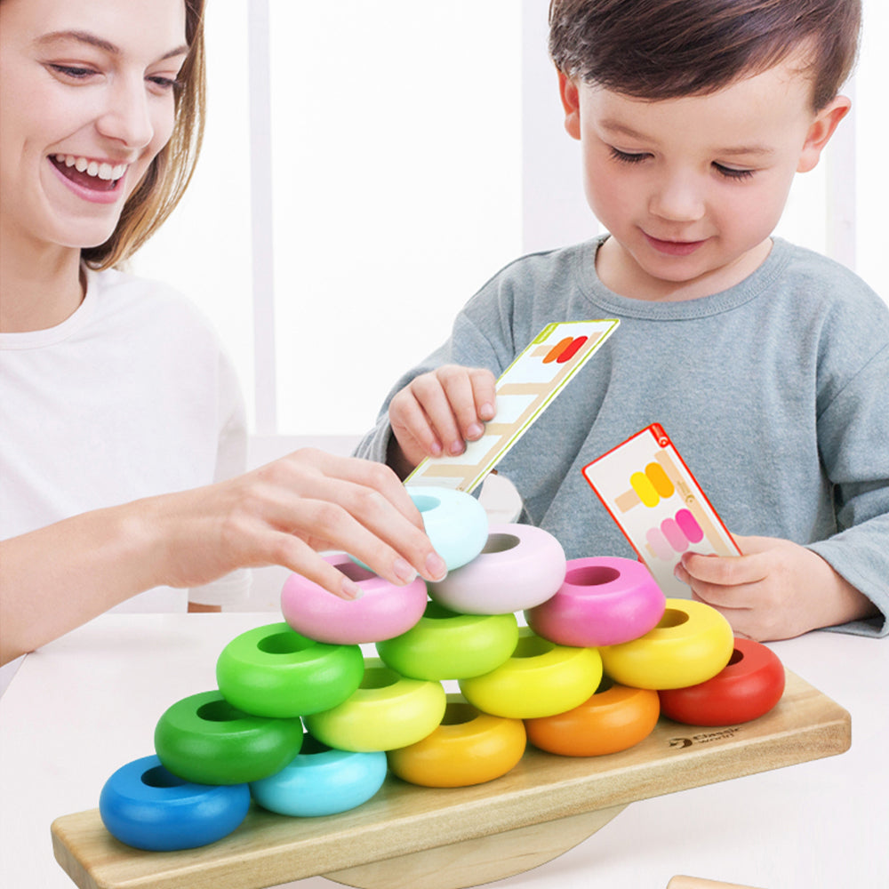 El exclusivo balancín de equilibrio "Apilar y Equilibrar" es divertido y desafiante. Su hijo desarrollará habilidades lógicas y de resolución de problemas mientras sigue las tarjetas para clasificar y apilar los discos de colores en el orden correcto.