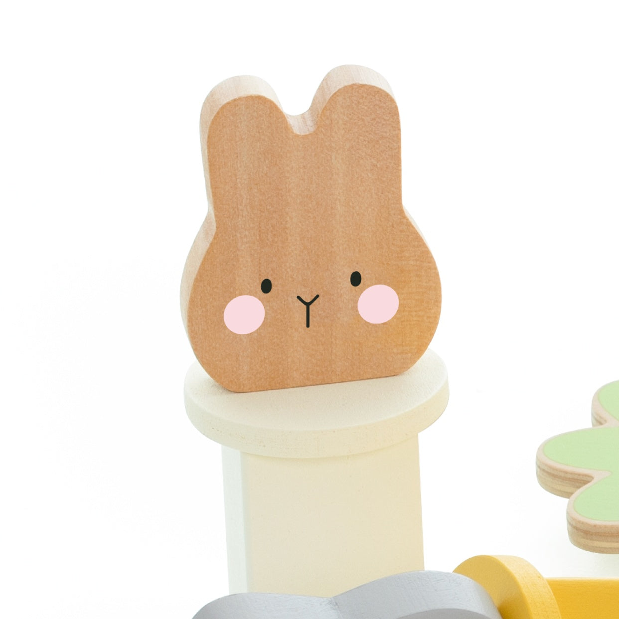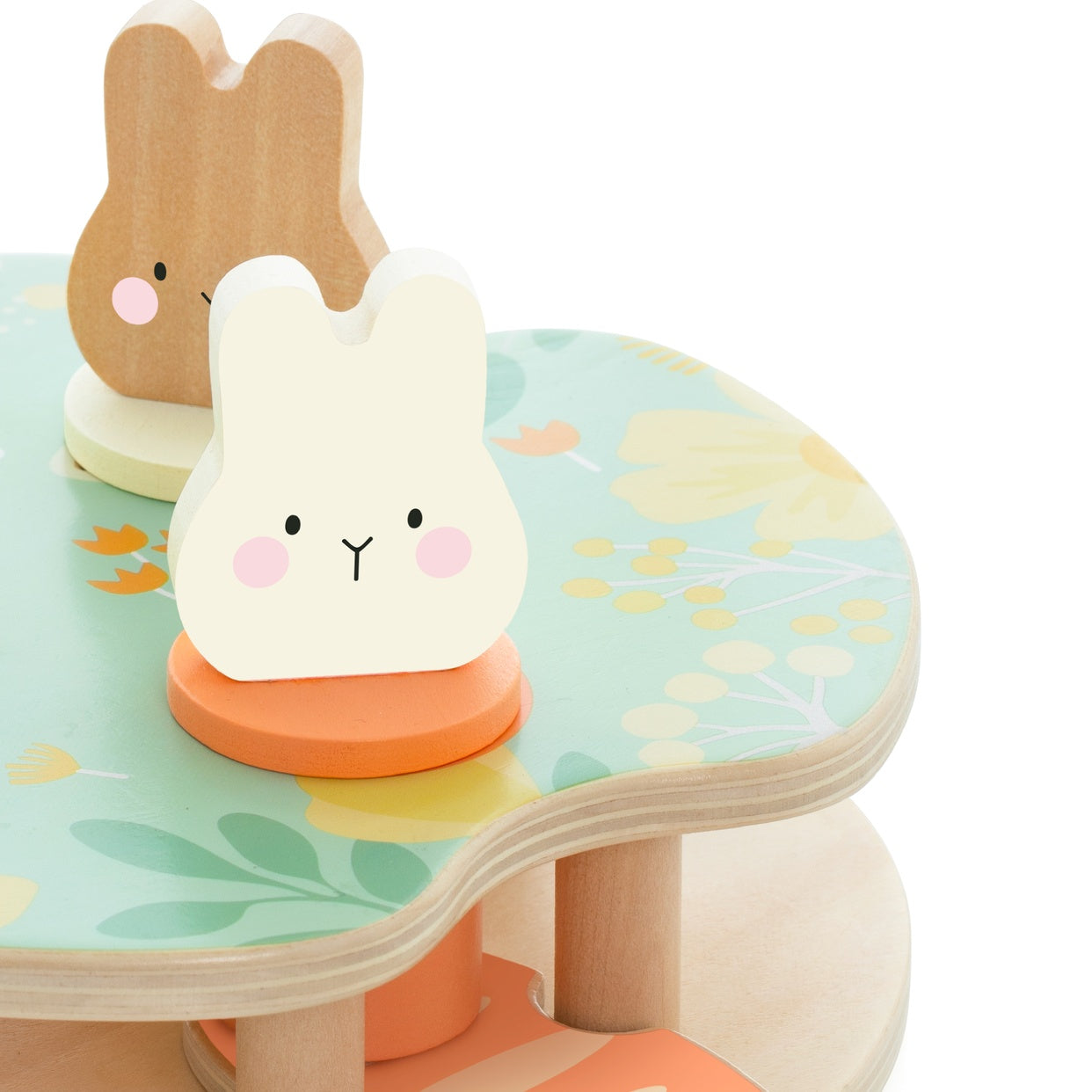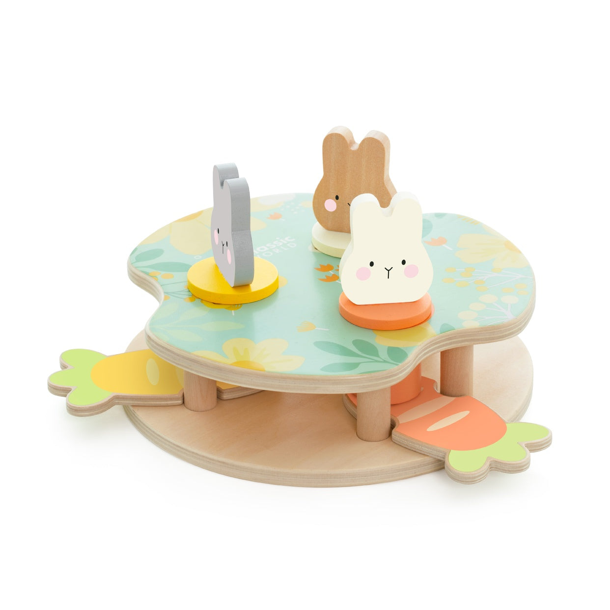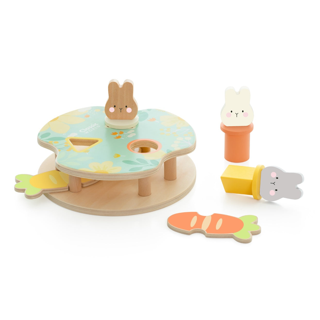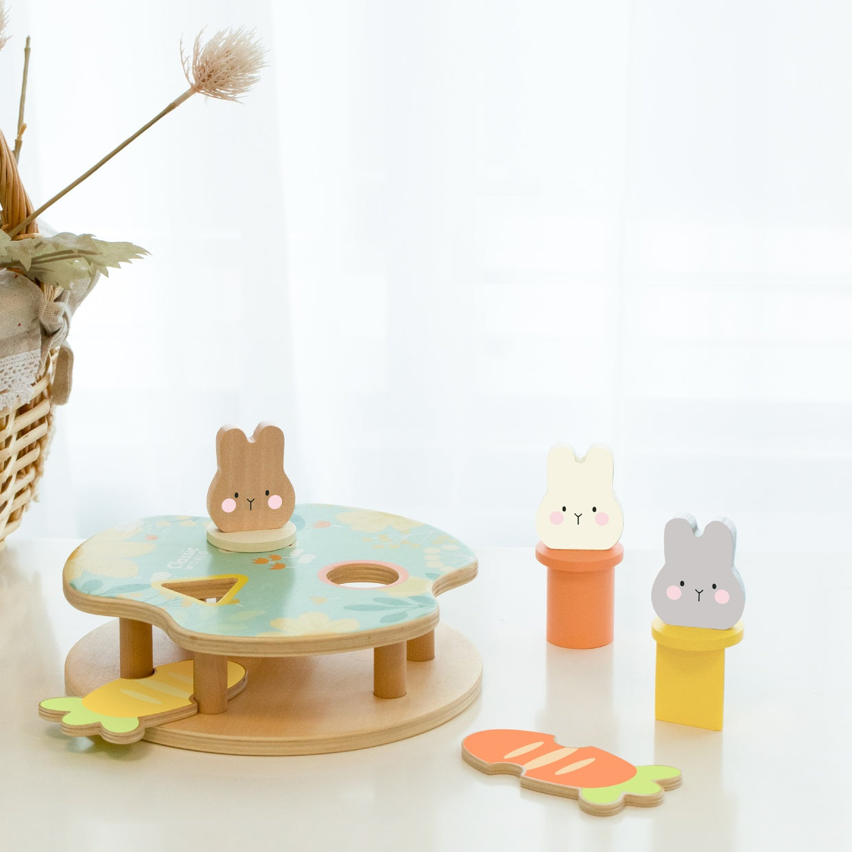 Un encantador juego de combinación de formas que mejora la conciencia del color y la forma de tu bebé. Se trata de colocar tres adorables conejitos en sus correspondientes entradas en la parte superior, basándose tanto en color como en forma. ¡Al presionar los trozos de zanahoria, los conejitos saltan de las flores! También ayuda a fortalecer la mano de su bebé.
