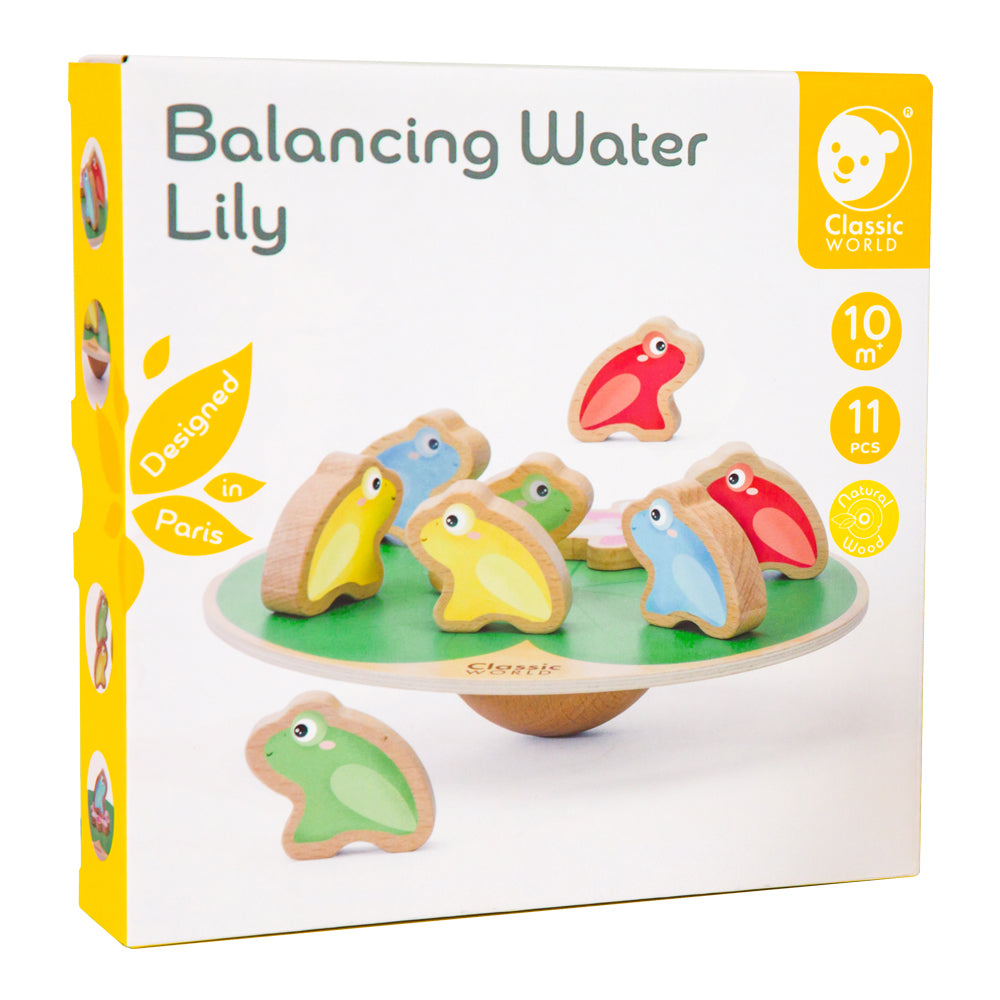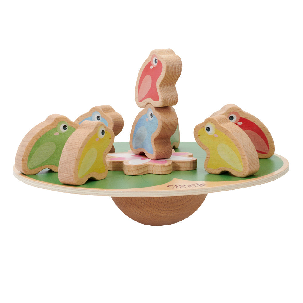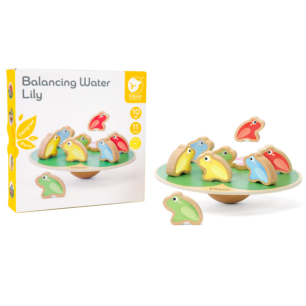 Mira las lindas ranas jugando en un lirio de agua, al lado de una flor de loto. Este es un juego de equilibrio con 8 ranas de colores y una flor de loto.