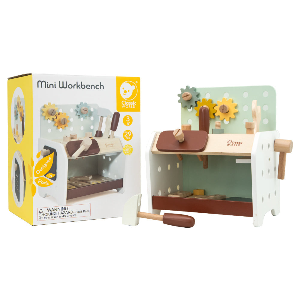 Este Mini Banco de Trabajo con mesa tiene todas las herramientas que necesitas para jugar como carpintero.