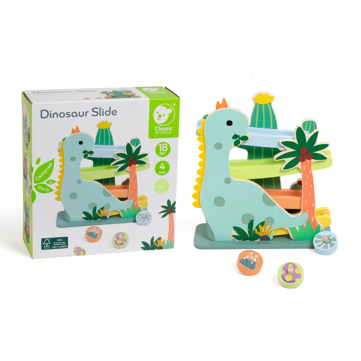 Este tobogán de dinosaurio consta de un tobogán de madera resistente y 4 encantadores elementos redondos de dinosaurios que inspiran aventuras imaginativas en el mundo de los dinosaurios a través del juego cinético.
