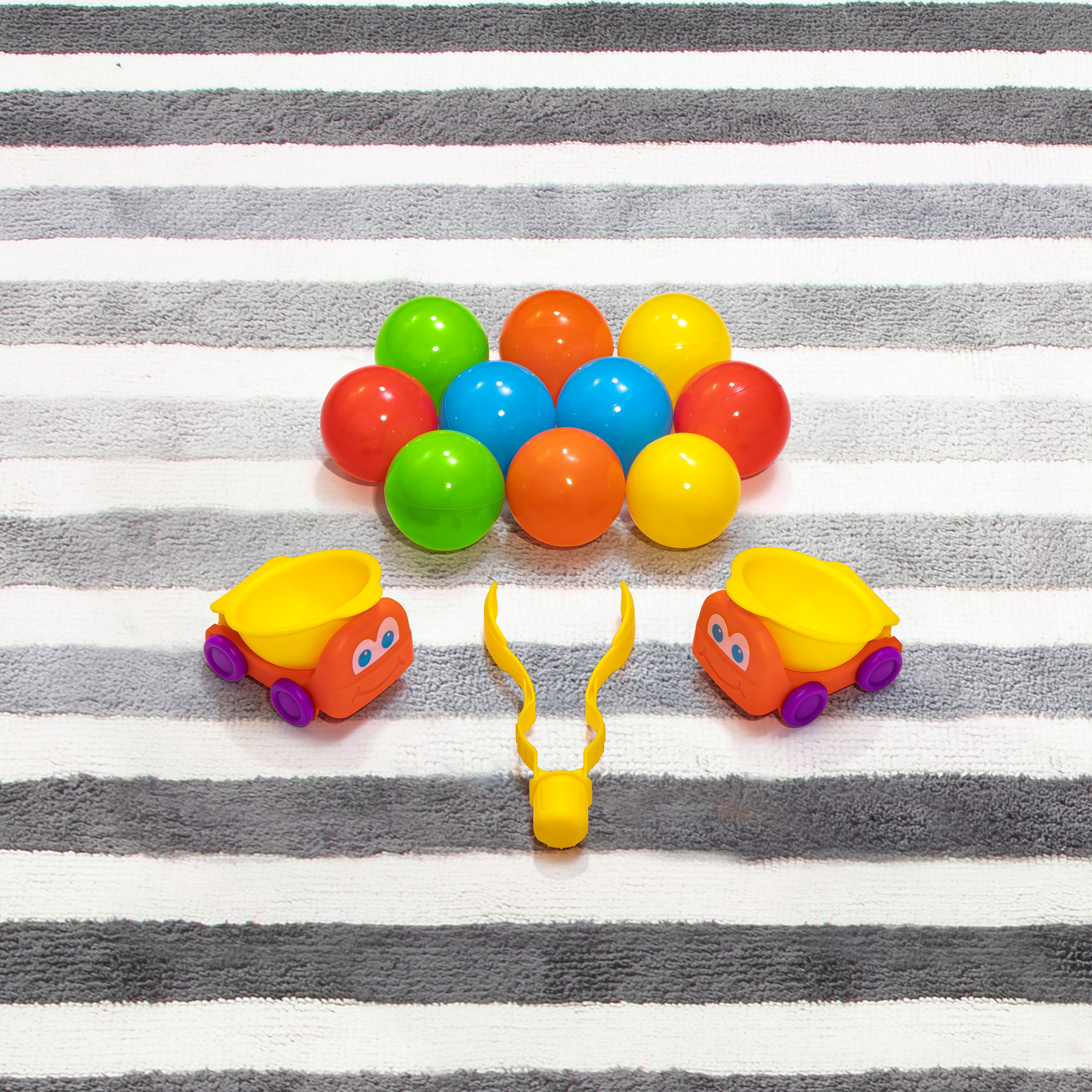 - En la caja: base de la mesa de actividades, 2 camiones de Ball Buddies, pinzas para recoger bolas, 10 pelotas de juego.