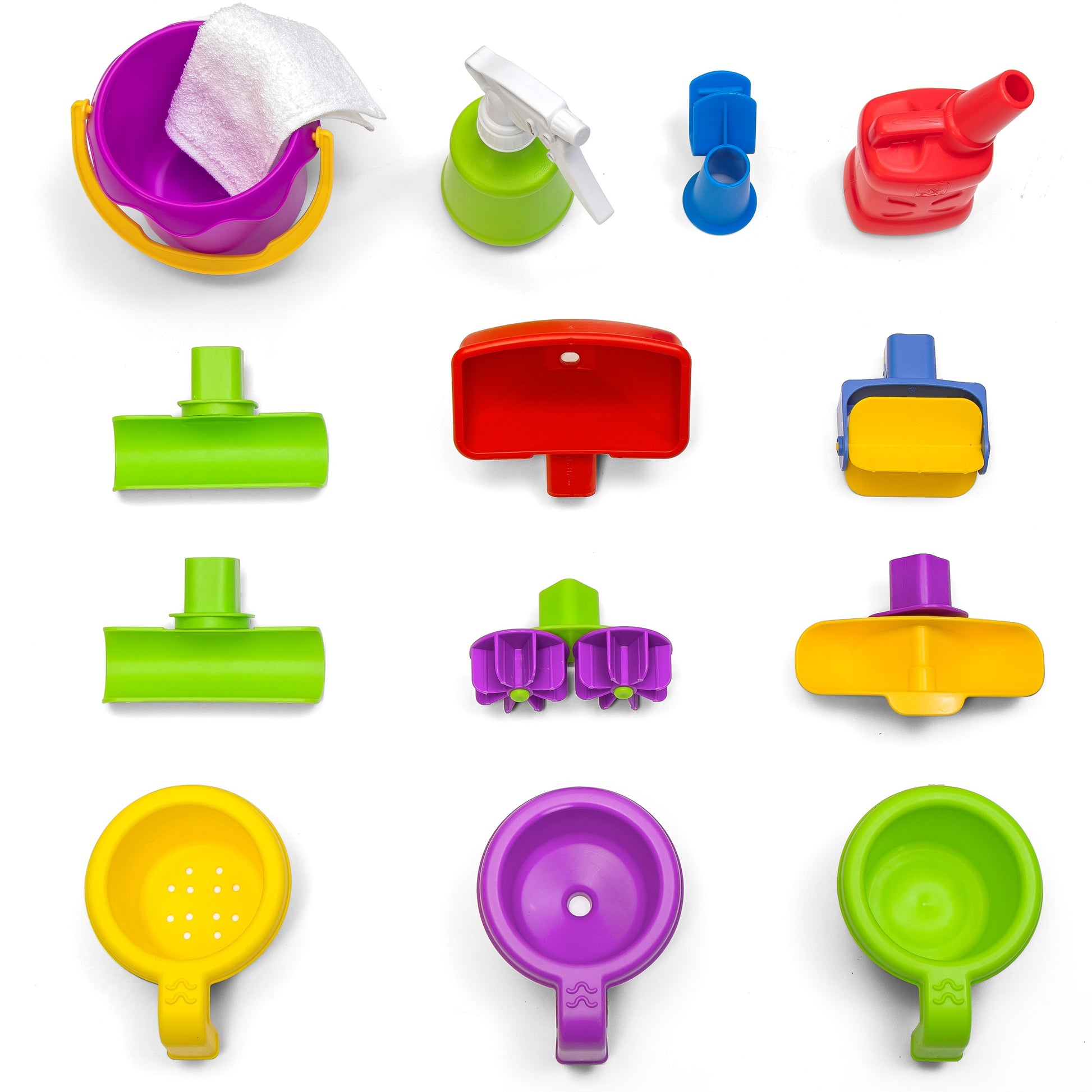 - Los niños escucharán el trago del agua en el "tanque de gasolina", el chirrido del limpiaparabrisas y la lluvia a medida que el agua se derrama por el laberinto, agregando una amplia exploración sensorial a la experiencia de juego del centro de actividades acuáticas.
