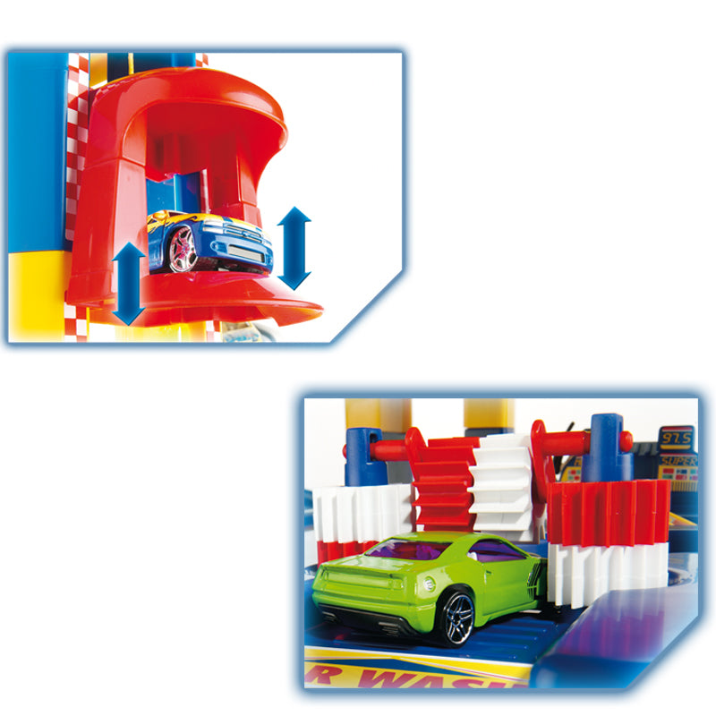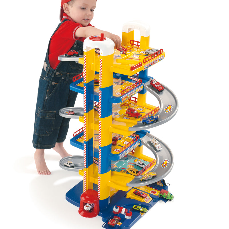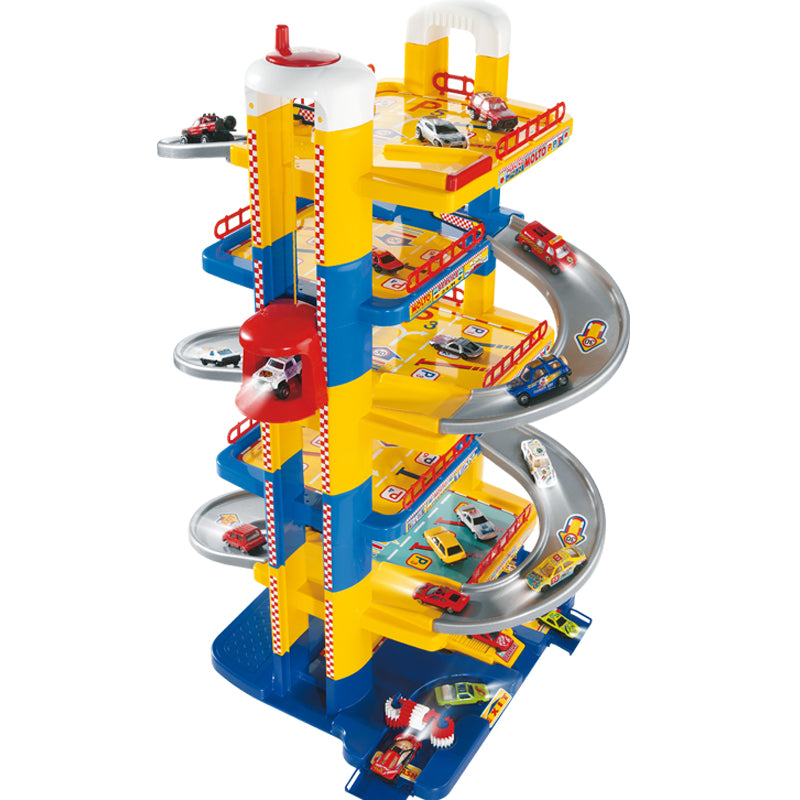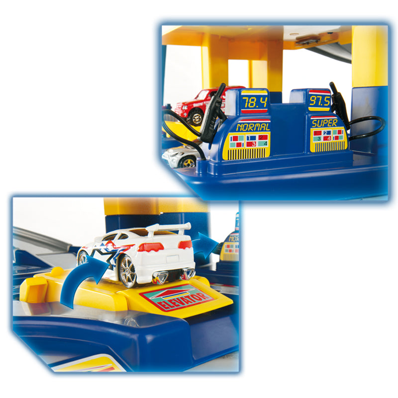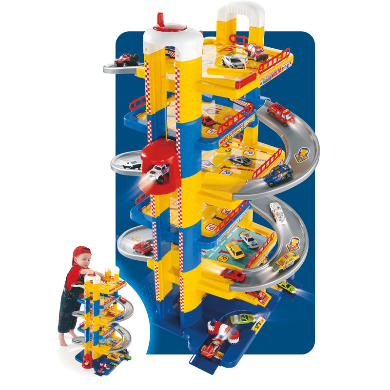 Cada planta se comunica entre ellas y el suelo mediante pistas inclinadas por donde circulan los coches fácil de montar y de mucha estabilidad, contiene ascensor, lavado de coches, engrase, estación de servicio y muchos accesorios, funciona sin pilas, coches no incluidos.