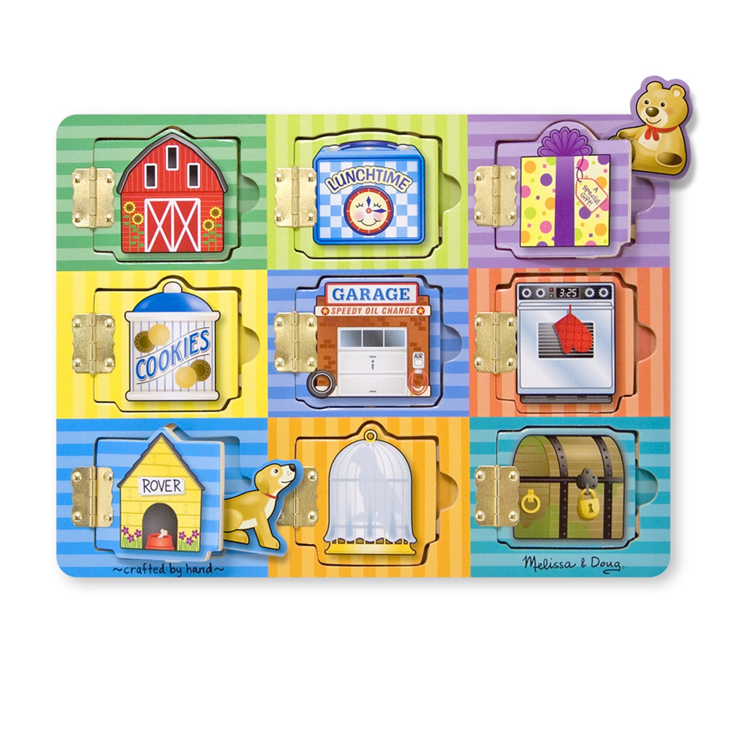 Este emocionante tablero de madera actividad cuenta con nueve puertas batientes. Cuando se abre, una pieza magnética colorida se revela. Mueve las piezas detrás de puertas diferentes para adivinar la diversión!